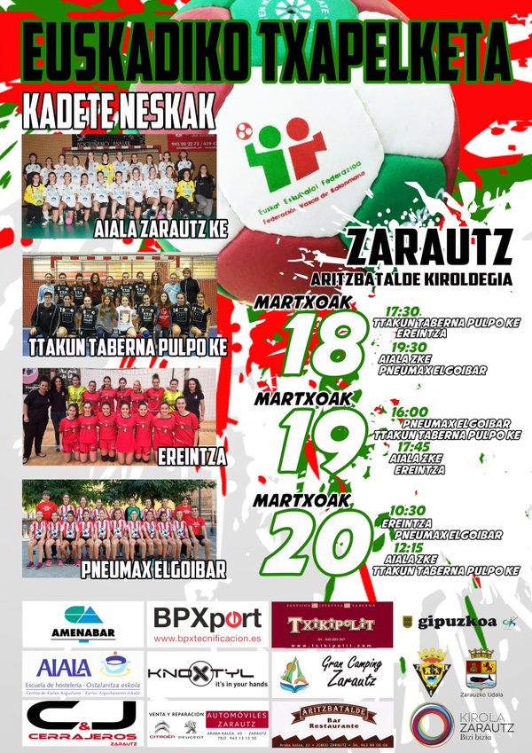 CADETE FEMENINO – FASE FINAL CTO EUSKADI(18-19-20/Marzo) SAILKAPENA: 1. AIALA ZKE 2. Ereintza 3. Elgoibar 4. Pulpo ARGAZKIAK: PULPO-EREINTZA >> AIALA -ELGOIBAR >> ELGOIBAR-PULPO >> AIALA-EREINTZA >> EREINTZA-ELGOIBAR >> AIALA-PULPO >> Partekatu: Share on X (Opens in new window) X Share on Facebook (Opens in new window) Facebook Atsegin dut Kargatzen...